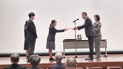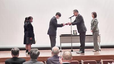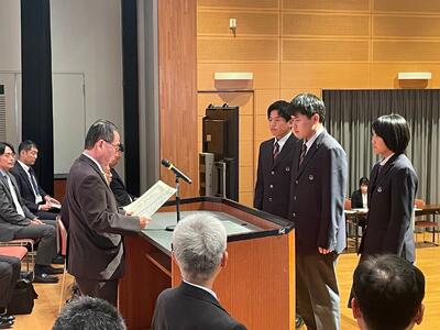 表彰式で、生徒たちは緊張の中にも取組を評価していただいたことに喜びを感じ、笑顔で受賞していました。