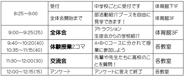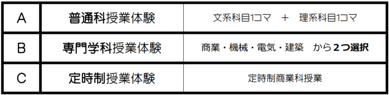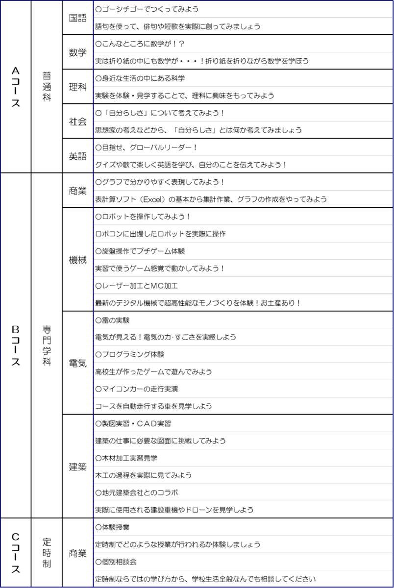 【当日の様子】 校長挨拶 生徒会による学校紹介 体験授業(数学) 体験授業(社会) 体験授業(英語) 体験授業(商業) 体験授業(機械科) 体験授業(電気コース) 体験授業(建築コース) |
