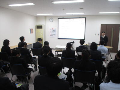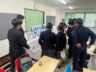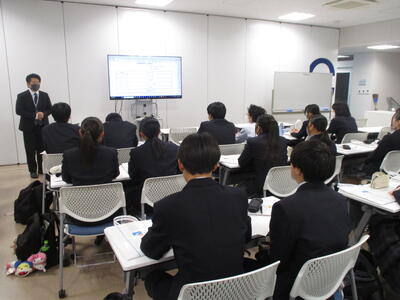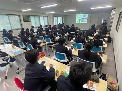 オジックテクノロジーズ合志工場では、企業概要説明の後に、ウエハ、アルマイト、パワーデバイスの3工程に分かれ、それぞれの内容や特徴などを見学、お話しいただきました。また最後は若手職員の方による学生時代の話などを聞くことができ、生徒は終始、真剣な表情で聞いていました。