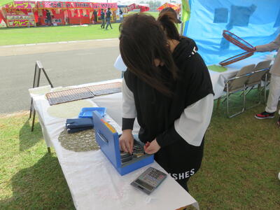 お釣りの準備等、レジの最終確認をします。最後に、隣接ブースに到着された出水中央高校様があいさつに来てくださいました。