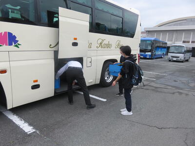 雨天の出発でしたが、協力して荷物をバスに積み込みます。