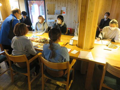 前回の検討会からおよそ一か月。この間にも、道の駅みなまたの館長様及びシェフの皆様は、通常の営業がある中、時間を捻出してこのコラボ企画のための研究及び下準備をしてこられていたのです。まずは、そのプロ段階での試作過程における所感からお話をしていただきます。生徒は、真剣にメモをとっています。