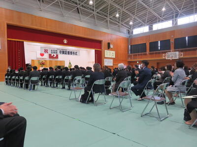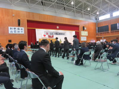 まずは式に先立ち、定時制の1名の先生に、60歳の節目に際してこれまでの永い歳月の間本県教育振興のためにひたすら尽くしていただいた多大な御功績に対する感謝状の授与が行われました。文面の最後には「今後ともますます御健勝にて御活躍されますことを期待します 熊本県教育委員会」と結ばれていました。