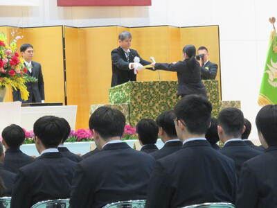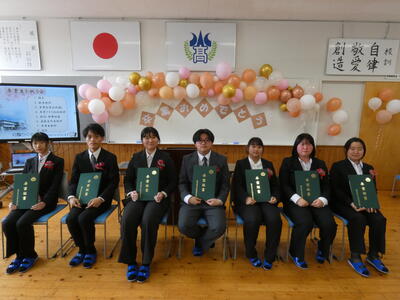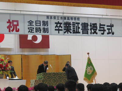 熊本県がんばる高校生表彰、産業教育振興中央会御下賜金(ごかしきん)記念優秀卒業生表彰、全国商業高等学校協会成績優秀者表彰、全国高等学校定時制通信制教育振興会表彰、熊本県高等学校定時制通信制教育振興会表彰、熊本県高等学校文化連盟表彰、熊本県高等学校体育連盟表彰、熊本県高等学校保健会表彰の各種卒業予定者表彰が行われ、式の結びには本校定時制の先生が1名、永年勤続に係る功労者表彰を、教え子たちが見守る中、授与されました。