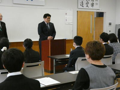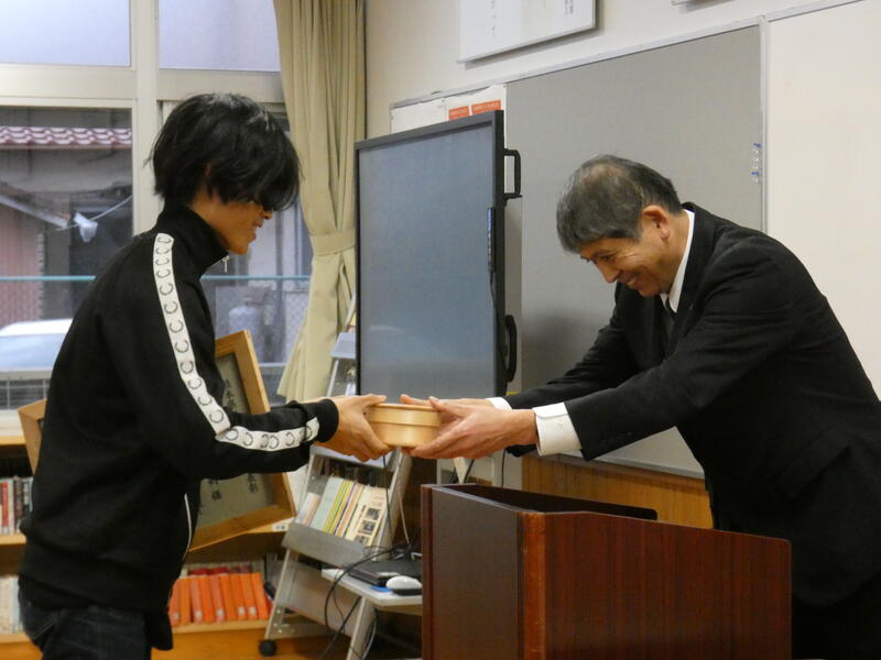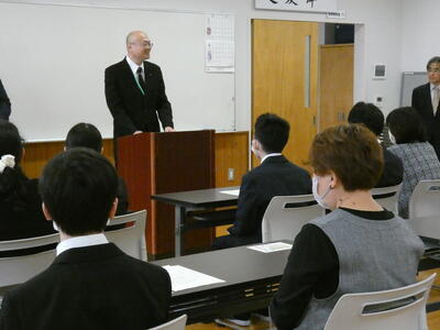 40年近く教員を続けてきて、このたび教師生活にピリオドを打たれる先生からは、今の生徒が最後の生徒となるわけですが、授業、学校行事、販売実習、試作実習等を楽しみながら頑張っている姿をほめていただき、成長した数年後がとても楽しみで、やるべきことをやっていけば夢は実現する。健康に留意して過ごしてほしい。水高生のプライドを持って夢を実現してほしいとの励ましのことばをいただきました。