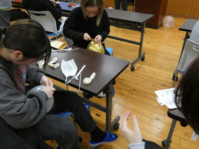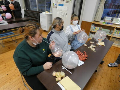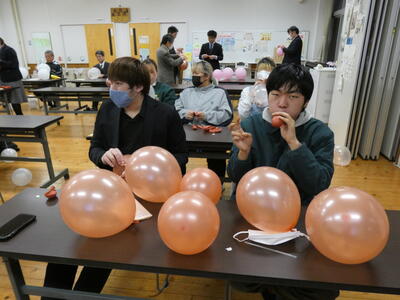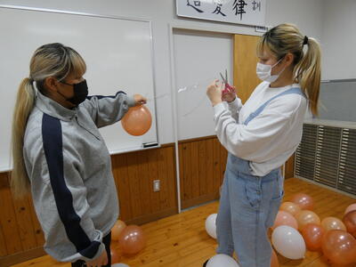 まずは説明を聴きます。やることは、風船を膨らませることと、ホワイトボードに貼る文字の切り抜き・風船に貼る養生テープ作りです。これらを分担して行います。風船はストローを使って膨らませます。ストローは浅く差し込みます。