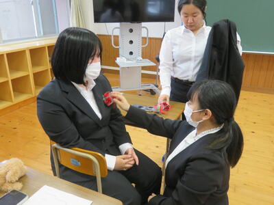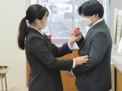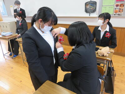 登校後は、教室に集合して最後の動作確認及びコサージュ装着を協力して行います。事実上、最後の教室でのひと時となります。