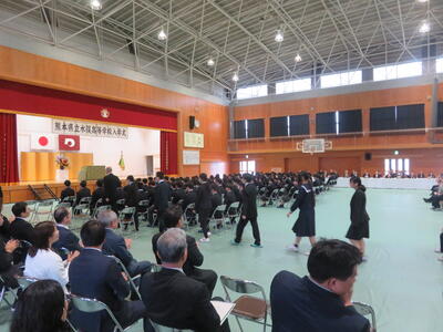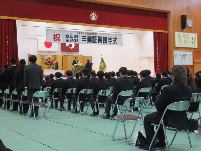 水俣高校は全定(全日制・定時制)合同で行います。本校体育館での厳かな式典は、実に入学式以来となります。3年振りまたは4年振り、あるいはそれ以上振りの生徒もいる中、それぞれの年月を振り返りながら、式に臨みます。