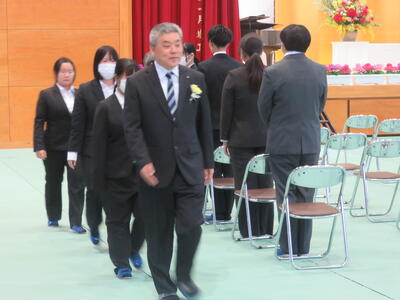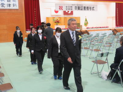 式歌斉唱・式後の行事の後、いよいよ卒業生退場です。全日制1組から順に退場し、最後に残った定時制7名が、担任の先生方の先導で退場します。