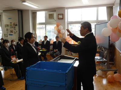 そして、いよいよ転退任式です。教頭先生から、転出される先生方お一人おひとりのご紹介がありました。