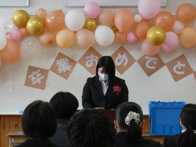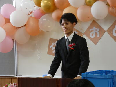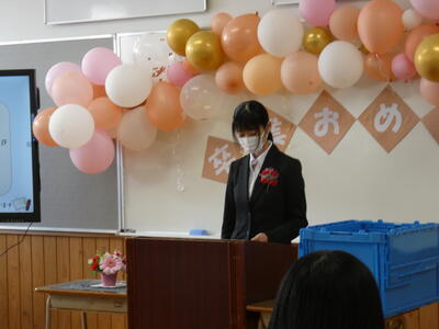 続いて、2年生の新生徒会長から惜別の挨拶がありました。先輩たちの背中を見ながら頑張れたことや、行事での楽しい思い出が語られ、寂しさの中でも先輩たちの卒業後の活躍を祈念する旨の立派な送別の言葉でした。