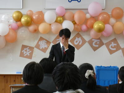 式典後のお忙しい時間帯の中、校長先生、副校長先生、教頭先生、事務長先生が定時制に来てくださり、校長先生からはお祝いと激励のお言葉をいただきました。中でも、校長先生が着任された年度の定通総体で、今回の卒業生がバドミントン競技で惜敗後に悔し涙を流していた思い出について触れられ、一生懸命練習してきたからこそ流れる涙の素晴らしさについて語ってくださいました。