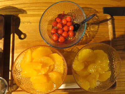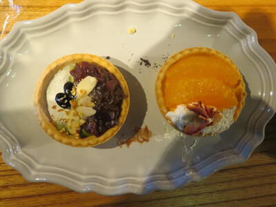 水俣茶及びプリンの両方をお皿に乗せ、各々、合いそうな具材をチョイスしてタルト生地に乗せていきます。