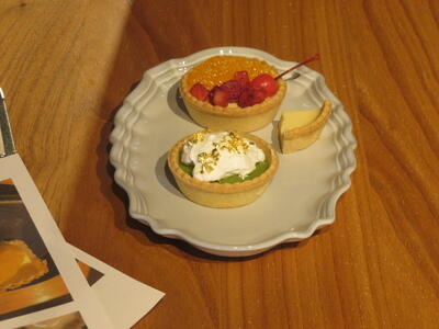 プリンタルトにはフルーツを乗せてみて、水俣茶タルトには生クリームを乗せてみます。金箔をかけると際立ちます。