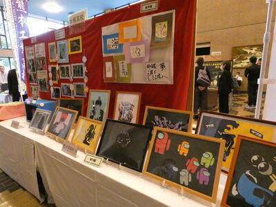 作品展示係の設営の様子です。本校生徒が創作活動の時間に制作した各種芸術作品を展示していきます。まずは、ボードに展示できる平面の作品から掲示していきます。