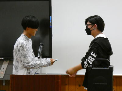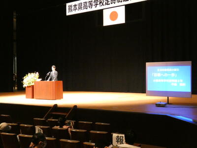 8月に実施された定通生徒会役員交流会の報告会が行われ、本校生徒会長がステージで説明を行いました。