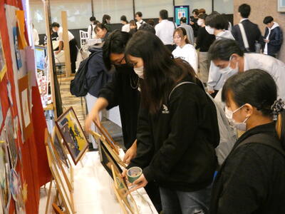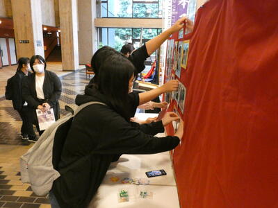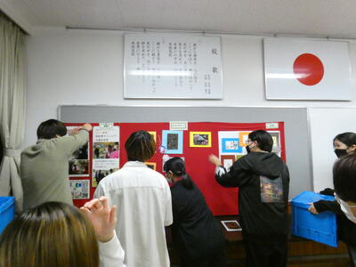 作品展示係の設営の様子です。本校生徒が創作活動の時間に制作した各種芸術作品を展示していきます。まずは、ボードに展示できる平面の作品から掲示していきます。