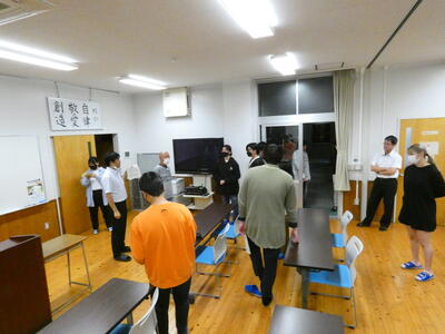 続けて、明日の流れについて説明を受けた後、まずは「展示準備係」及び「ランチタイムショップ準備係」並びに「弁士・審査員・ステージ係」に分かれて準備・打ち合わせです。
