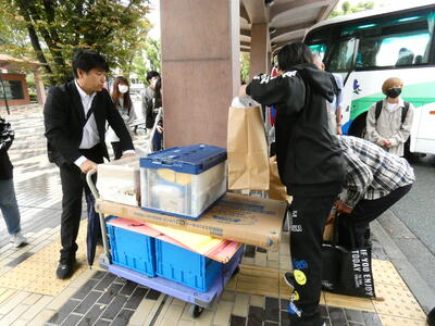 県立劇場に到着したら、作品展示と販売実習のための荷物を降ろします。