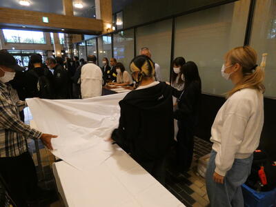 まずは、土台となる白いシートを敷いていきます。テーブルとテーブルの間に折り目を曲げ、丁寧にメイキングをしていきます。「のぼり」は本校の屋号が入った貴重なPRアイテムですので、確実に棒に通しながら広げていきます。