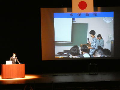 続いて、各校からの発表の時間です。本校からは水俣高校定時制の1年間の行事の紹介をしました。