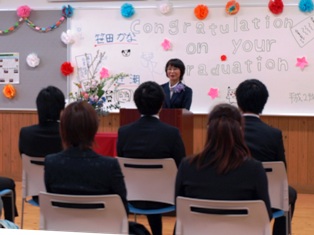 卒業生を祝う会では、卒業生一人ひとりが担任の先生から卒業証書を受け取りました。その後、教頭先生、PTA定時制会長からお祝いのあいさつをいただき、4年・3年担任からもお祝いの言葉がありました。感極まって涙する場面もあり、3年間・4年間の思いが込み上げていました。卒業生あいさつでは、『親や先生、友達の助けがあり、卒業することができました。ありがとうございました。』と感謝の言葉を述べていました。最後には出席者全員で写真撮影を行い、卒業生との別れを惜しみました。卒業生の皆さん。ご卒業おめでとうございました。