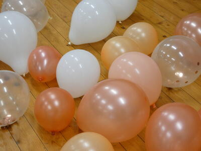 まずは説明を聴きます。やることは、風船を膨らませることと、ホワイトボードに貼る文字の切り抜き・風船に貼る養生テープ作りです。これらを分担して行います。風船はストローを使って膨らませます。ストローは浅く差し込みます。