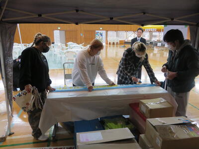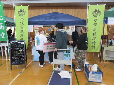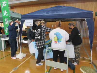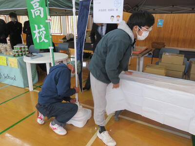 室内でも、店舗らしくテントを立てていただいていました。おなじみ水色の屋号は、テーブルの高さの関係から、校名が見える範囲で折り曲げて貼り付けます。いろいろとよく考えてくれます。