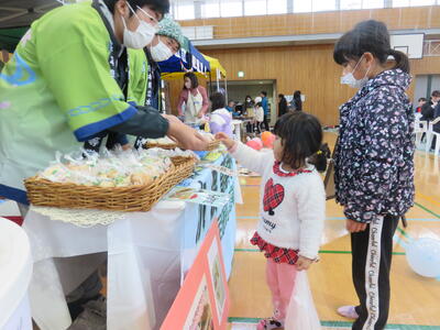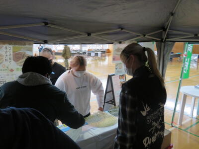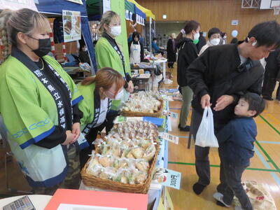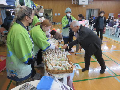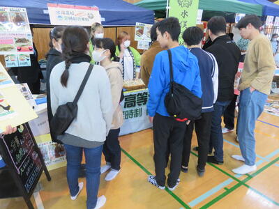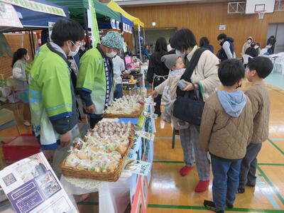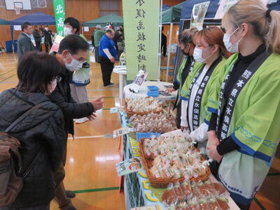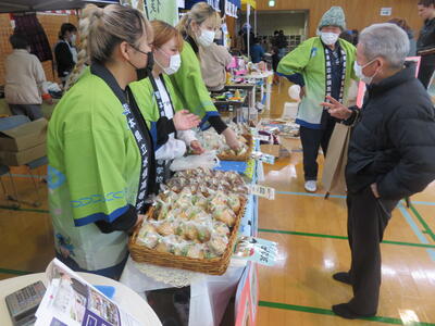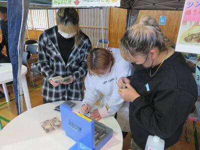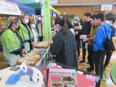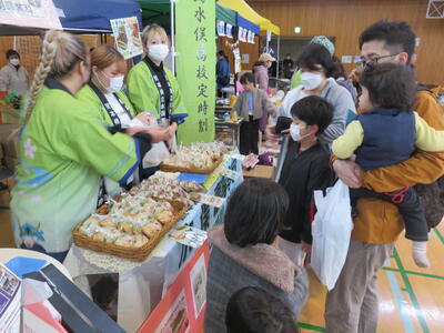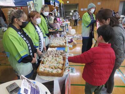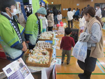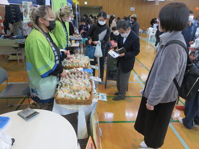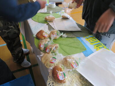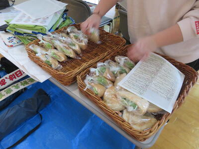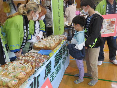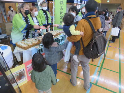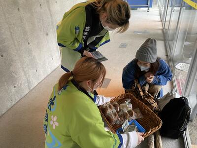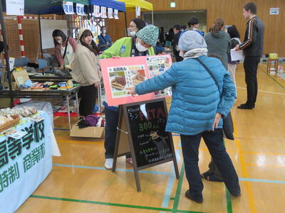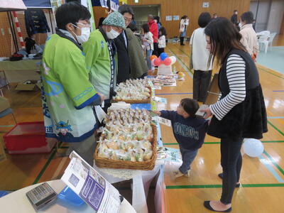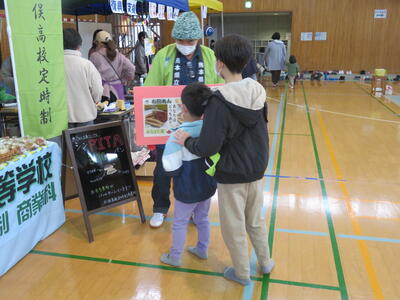 親子連れのお客様は、お子さんが「これください」と示し、お金も渡します。「高校生の販売実習」に対して「消費者教育」も同時に行われている形となりました。お子様のお客様が多い「あしきた青少年の家」でのイベントならではの光景です。