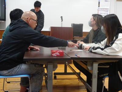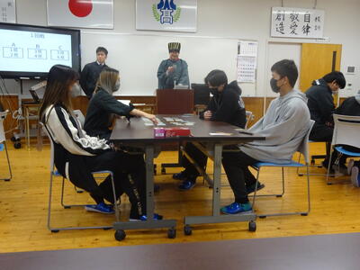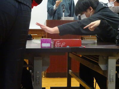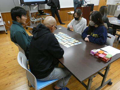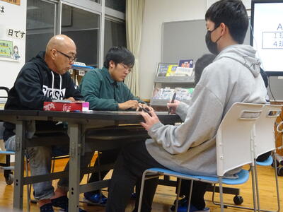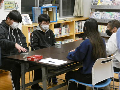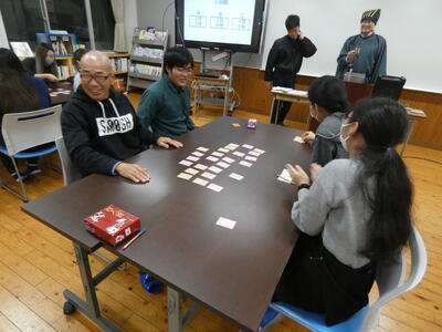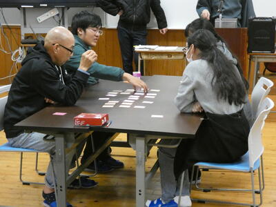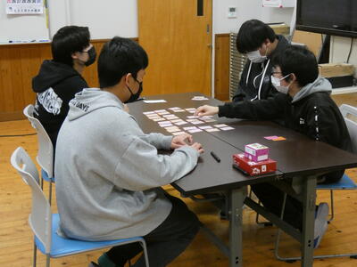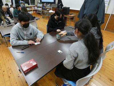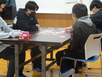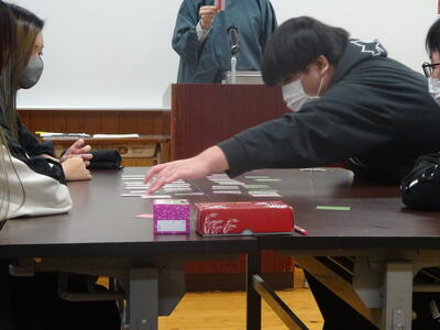 すなわち、実戦上は各テーブルごとに2人対2人の対戦となり、班対抗の組み合わせを変えて、それを4回対戦するというものです。ただし、表彰は取得した札の数を個人で競い、数の多かった生徒から順に3位まで表彰します。