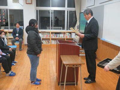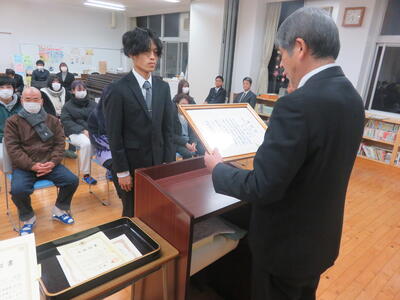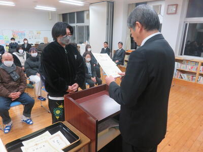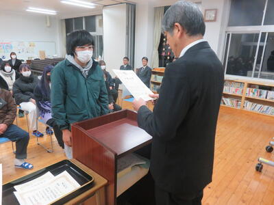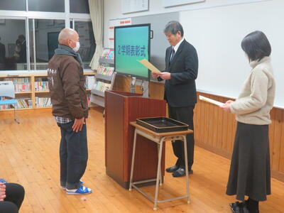 熊本県高等学校定時制通信制生活体験発表大会優秀賞、全国商業高等学校協会第71回ビジネス文書実務検定第1級、及び第3級(速度部門)、同協会第147回ビジネス計算実務検定第3級、第56回蘇峰筆塚顕彰書道展銀賞、2学期皆勤賞、2学期無欠席賞。表彰は以上になります。