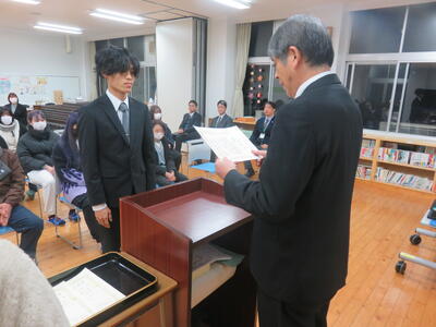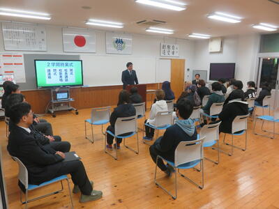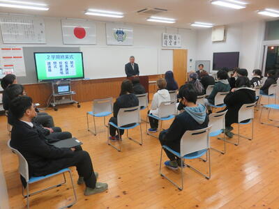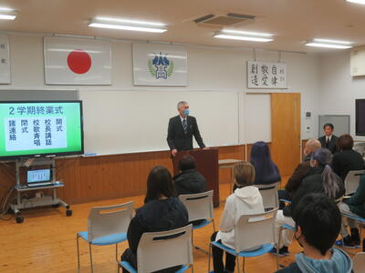 校長講話では、行事が目白押しであった2学期を振り返り、定通文化大会、校外研修、文化祭、販売実習といった諸活動を進めていくなかで、それぞれ準備や声出しによく頑張ったことをほめてくださいました。併せて、各行事の成功のために準備・運営に携わってくれた各校の先生方や、協力してくださった地域の皆様への感謝の気持ちも忘れないでほしいといったお話がありました。