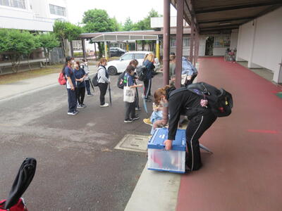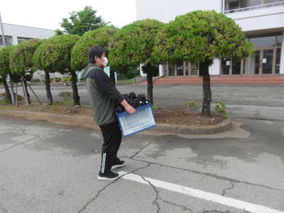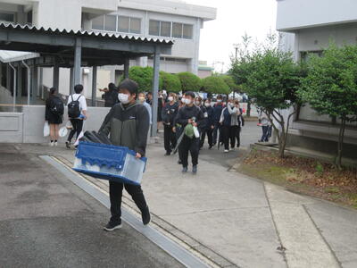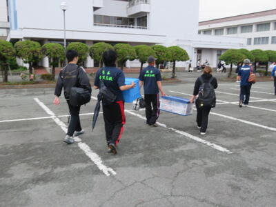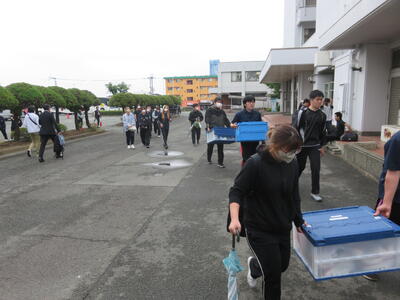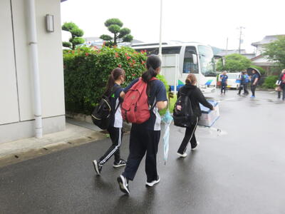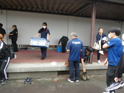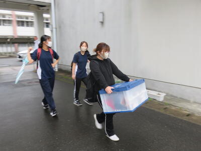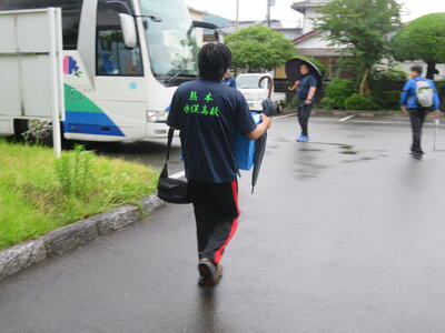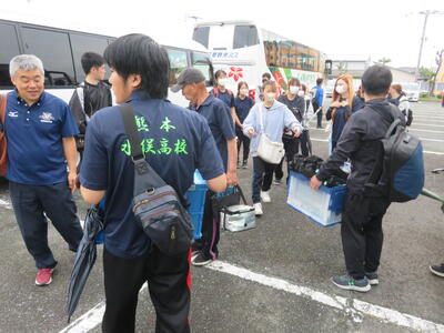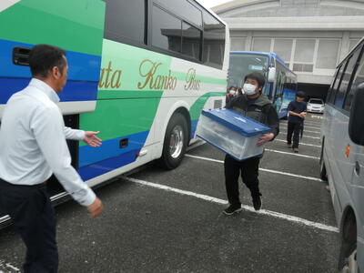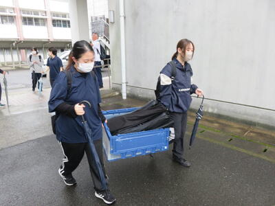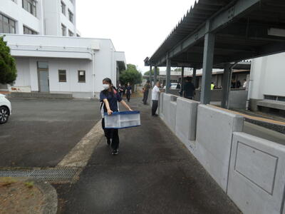 熊本市の湧心館高校では、バドミントン競技があります。こちらも雨で大変ですが、協力して荷物を降ろします。