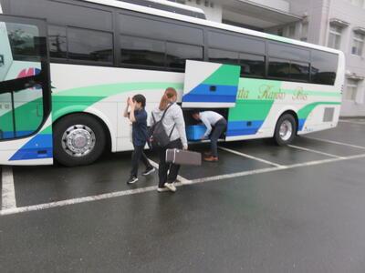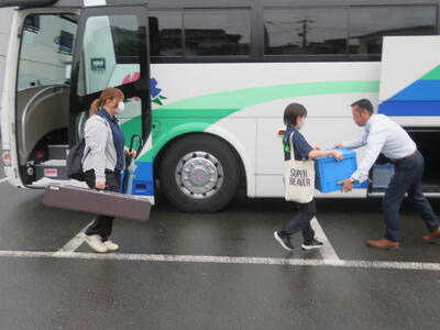 雨天の出発でしたが、協力して荷物をバスに積み込みます。