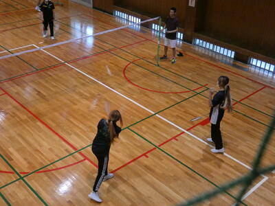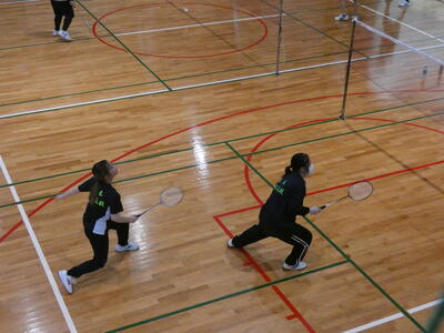 女子の部ダブルスは、4組中まずは1年生ペア1組が先に出場し、とても良い試合展開を繰り広げ、見事にデビュー戦初勝利をあげました。その後の2年生ペアの1組も奮戦し、初戦を突破しました。