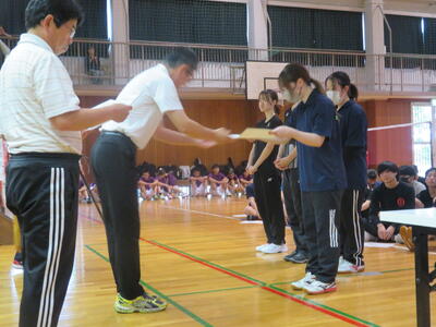 限られた練習期間を経て、生徒諸君は学校の代表として堂々たる試合を展開してくれ、水俣高校のために活躍してくれました。仲間が出場しているときは、下まで降りて来て応援する様子等、それぞれの友情を垣間見ることもできました。工夫して作戦を立てて戦いに挑む姿は、探究する力を育み、主体的な学びで夢(願い)を実現しようとする立派な姿でした。