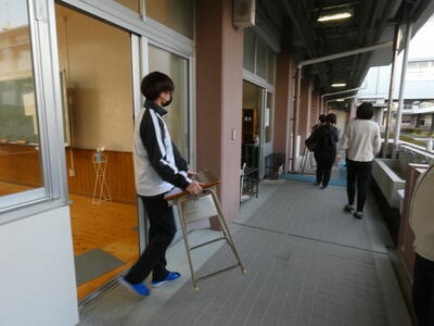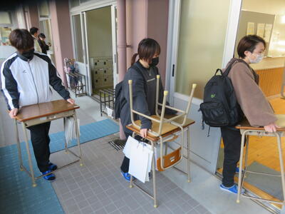 3年生から順に、4年生教室へ。そして下級生が続きます。並行して、先日卒業した上級学年の机、椅子を1年生教室に運びます。