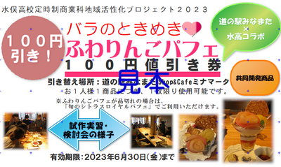 これです!! 本校定時制商業科が道の駅みなまたShop&Cafeミナマータ様と、昨夏より研究開発をすすめ、今春、新発売までこぎ着けた新開発コラボ商品「バラのときめき ふわりんごパフェ」の100円値引き券の発行です!