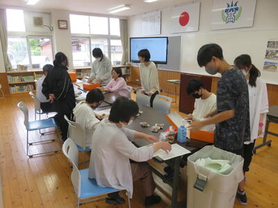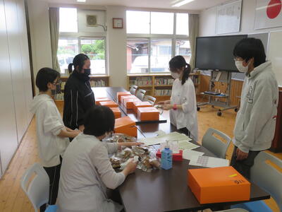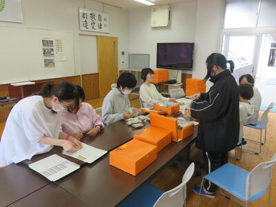 今回も、ONITSUKA日昭堂様のご協力のもと、本校定時制商業科との共同開発商品、毎度おなじみ水定どら焼きのシール貼り作業です。