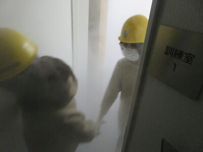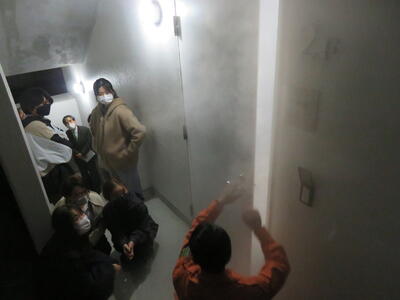 煙が充満した室内を、手探りでたどっていく訓練です。本当に前が見えない状況で、無事に退出に成功しました。