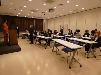 そして、その後は2班に分かれて学習します。講義では、「みんなで考える防火安全の知恵」と題した動画を視聴しました。