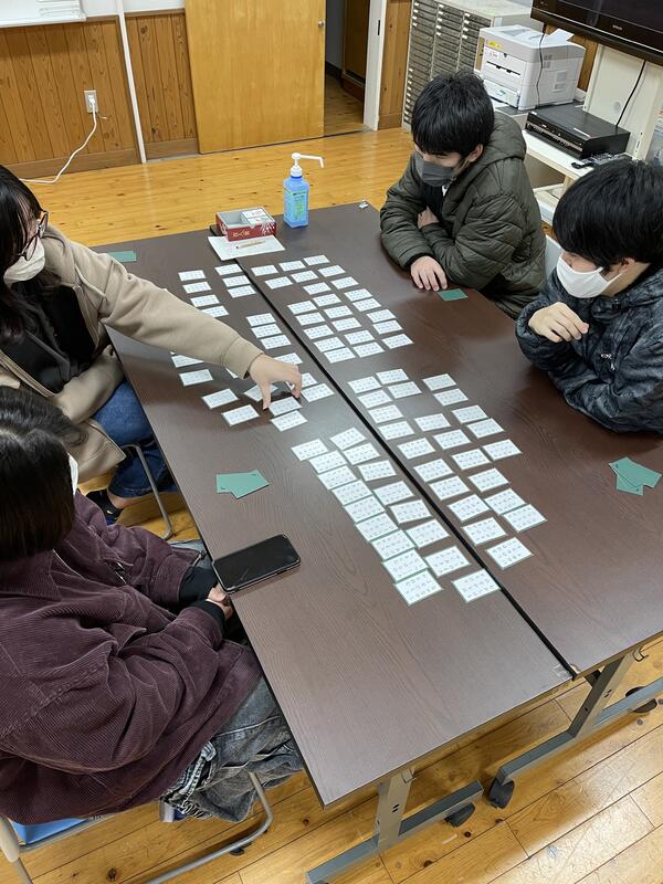 2人1組で12班作り、百人一首を3試合、坊主めくりを2試合行ないました。班分けはくじ引きで行なったため、違う学年と組む班もありましたが、とても楽しい雰囲気で交流できていました。