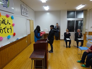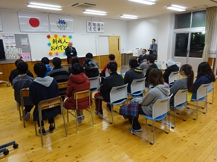 新成人を祝う会では今年度二十歳を迎えた生徒に対し、みんなでお祝いをしました。教頭先生からは「未成年のうちは親が保護者として守ってくれる部分もあったが、成人になると、親は保護者ではなくなり、責任は全て自分にある。」というお話をいただきました。それに対し「立派な大人になります。」と新成人の抱負を述べてくれました。新たな門出を迎えた新成人のみなさん。本当におめでとうございました。