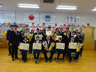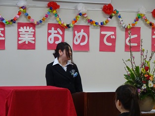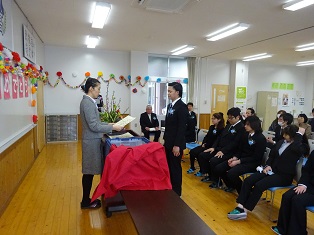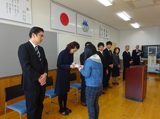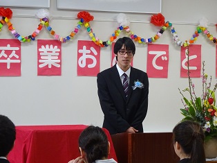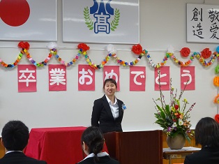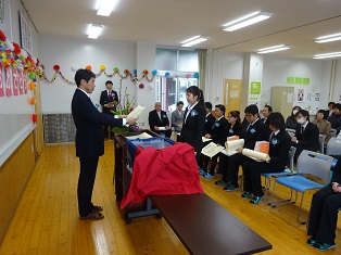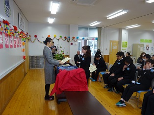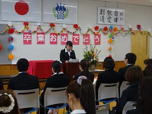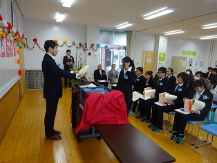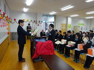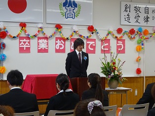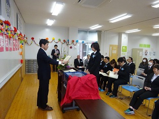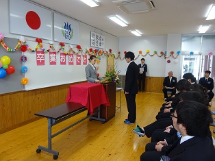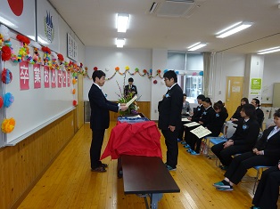 3月1日(木)に第4回卒業証書授与式が全定合同で挙行されました。緊張した表情で式に参加した卒業生の9名。定時制を代表し、4年生の齊藤くんが校長先生より卒業証書を授与していただきました。担任からの呼名の際には大きな声で返事をしていました。在校生も4名出席してくれており、先輩の凜々しい姿に感動していました。卒業生を祝う会では、各担任から一人一人卒業証書を受け取りました。その後教頭先生、担任から卒業生に向けて話をしました。最後に卒業生全員からも話をしてもらい、『水俣高校定時制でよかった』という気持ちがあふれる会となりました。卒業した9名の皆さん。次のステージでの活躍を楽しみにしています。卒業おめでとうございました。