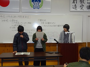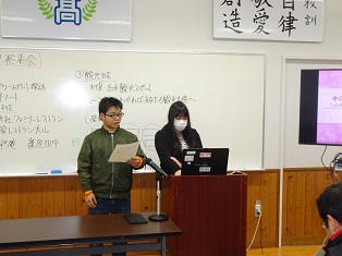 3月16日(金)3・4限目に調べ学習発表会を行いました。3限目は発表会に向け、原稿作成や発表の練習などを行い、本番に向けてそれぞれの班での活動となりました。4限目の発表会では、歴史班は水俣袋のパワースポット探訪・徳富蘇峰ノートの2つのテーマ、食事・スイーツ班は水俣編では水光社ファミリーレストラン・民家レストラン大山、出水編では耦祥庵・菓匠田中の2つのテーマで、観光班は水俣・出水観光スポット~これさえわかればあなたも観光大使~というテーマで発表をしました。インターネットで調べたり、自分の目で確かめたり味わったりとそれぞれの班が工夫を凝らした発表でした。地元でも知らない新発見など、実際に行ってみたいと思わせてくれる内容に仕上がり、本当にいい発表会でした。皆さんお疲れ様でした!