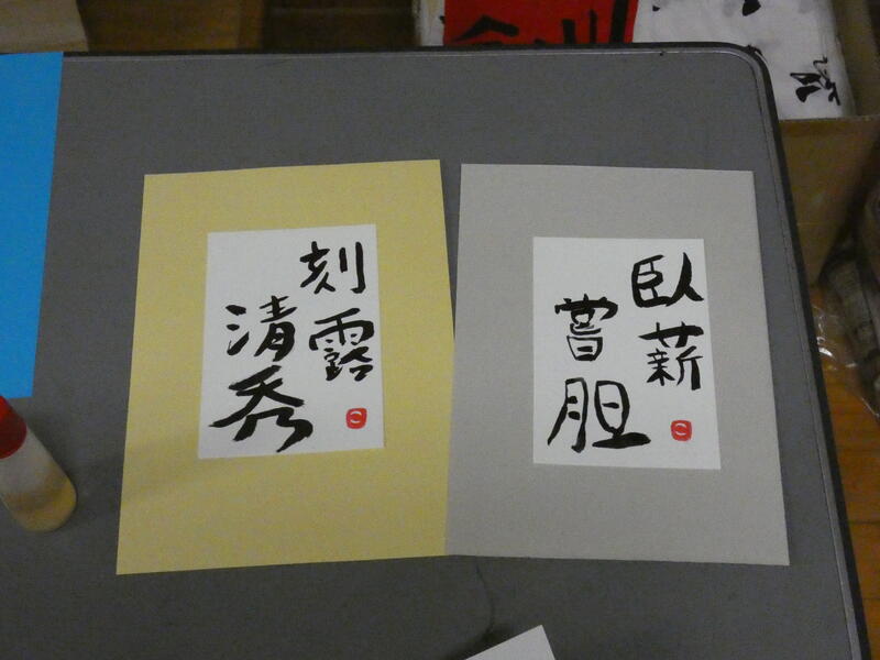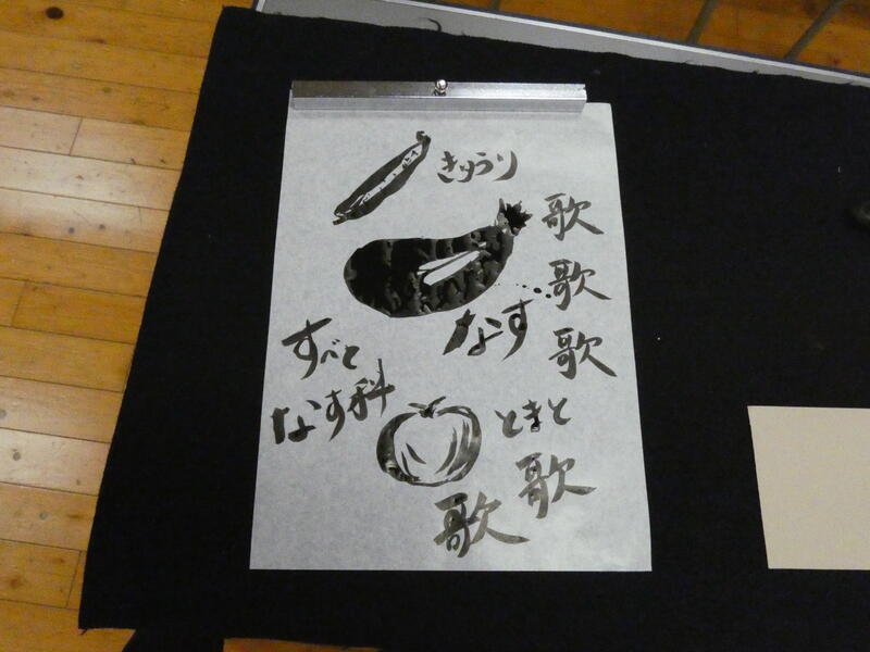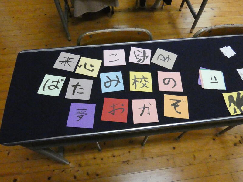 そのあとは、裏に絵や言葉などが書かれた絵はがきを作成したり、右下の写真は校歌の歌詞を一人一文字ずつ担当して書いたりしました。