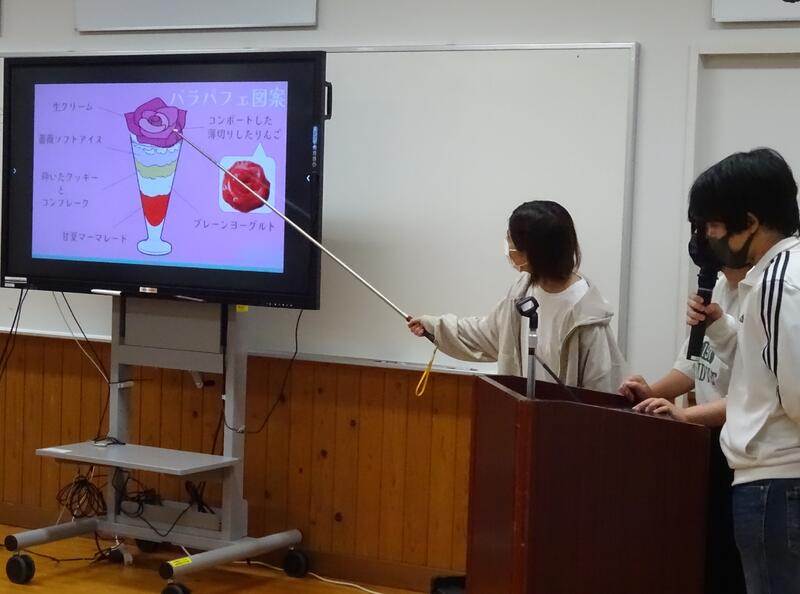 A班は、エコパーク水俣内にある「バラ園」を意識した、バラパフェとプリンタルトを考案しました。