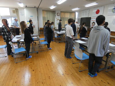開会行事の後、まずはレクリエーションを通して各校の親睦を深めます。主管校等の生徒さんたちが考え出した、トーク形式の簡単なゲームです。様々なテーマに基づいたトークを展開します。学校生活に関するいろいろな話が飛び交い、「あるある!」と和やかな雰囲気で共感する様子も見られました。