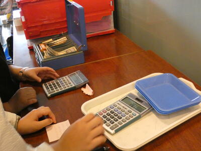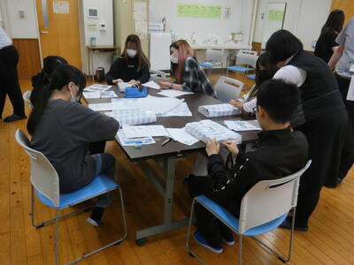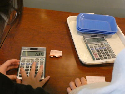 会計の準備のため、あらかじめ先生が用意しておいたお釣りの確認をします。協力して紙幣・硬貨を数え、先生に報告します。