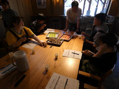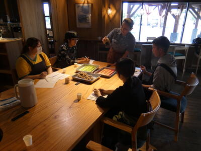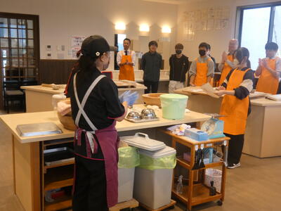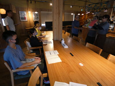 まずは、今回の講師の先生方の紹介です。道の駅みなまたの館長様及びシェフの方々です。その後、参加生徒の自己紹介です。今回は、4年生2名・3年生4名が参加させていただきました。